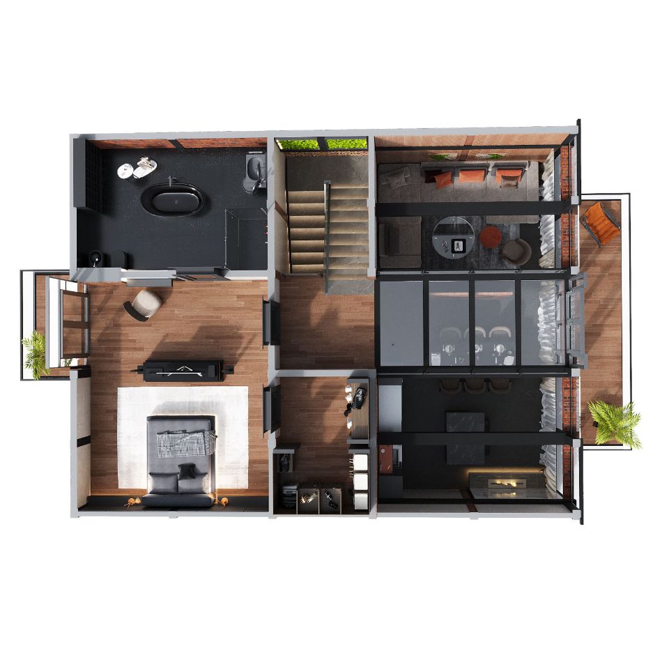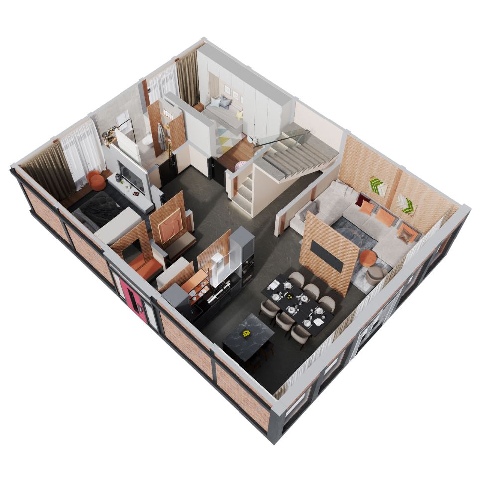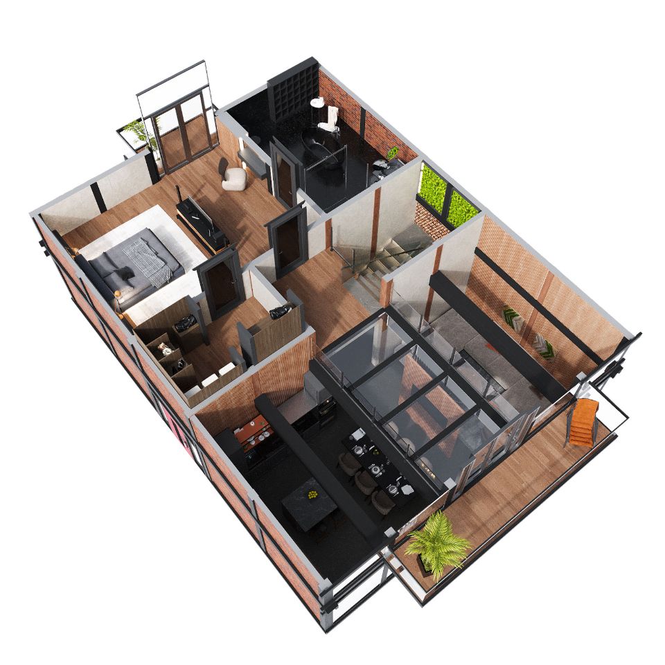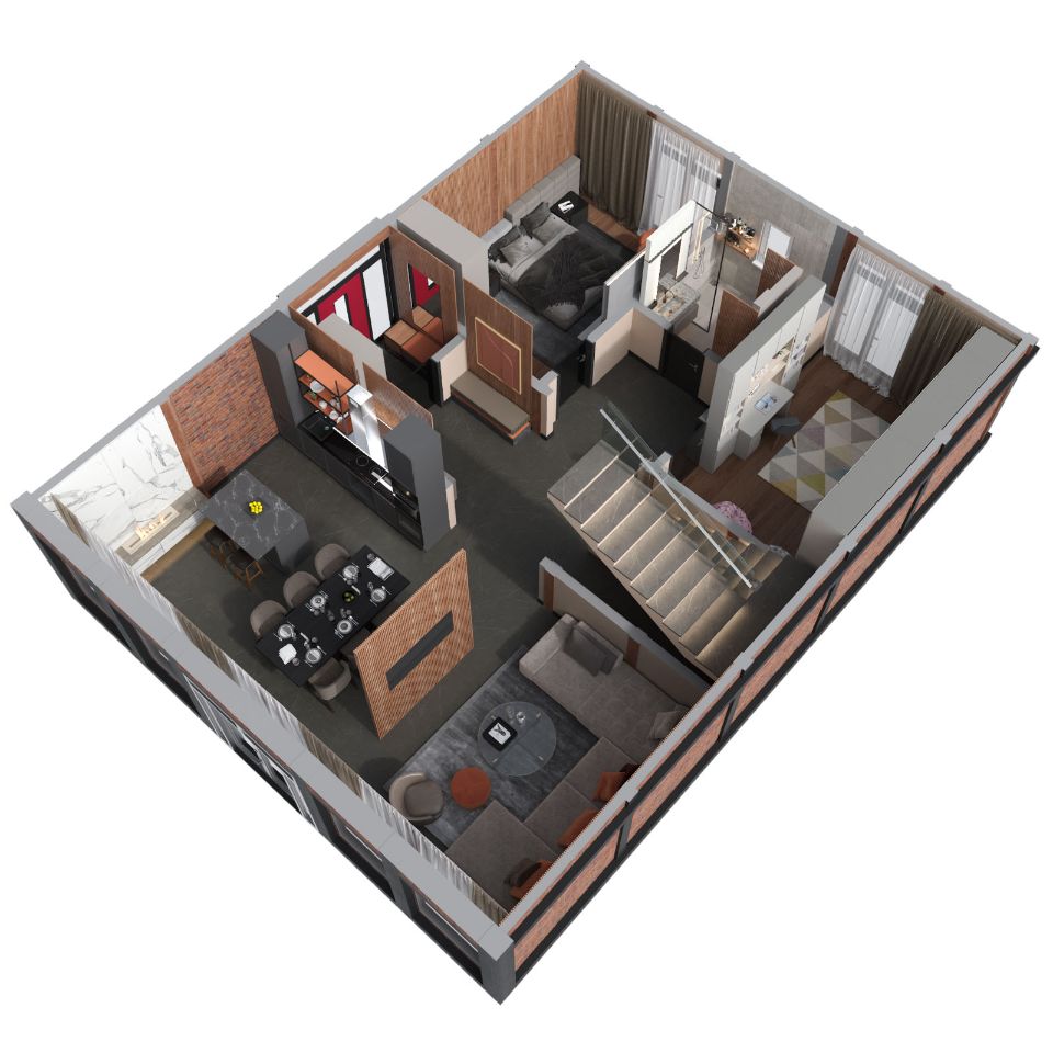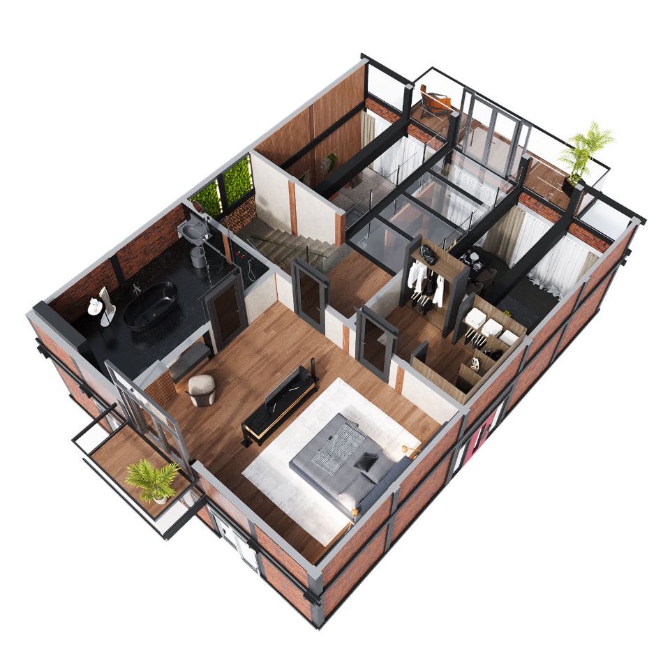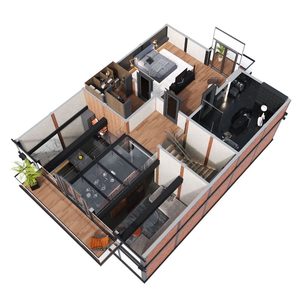 "BrillHouse Seven" подчеркнет свободолюбивый дух своего владельца парящими конструкциями открытых балконов на мансардном этаже с обеих сторон здания, а смелость в принятии решений - прозрачным полом из прочного закаленного стекла над просторной кухней-гостиной с камином. Уникальное стекло с переменной прозрачностью способно не только преобразить весь интерьер в зависимости от ситуации, но и обескуражить гостей, которых с комфортом можно разместить в спальне на первом этаже. Здесь зону отдыха дополнит финская сауна для расслабления после тяжелого трудового дня и получения заряда бодрости и энергии.