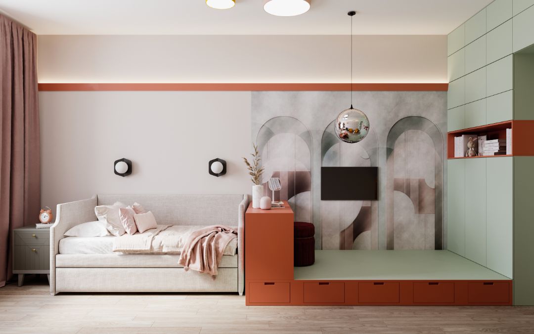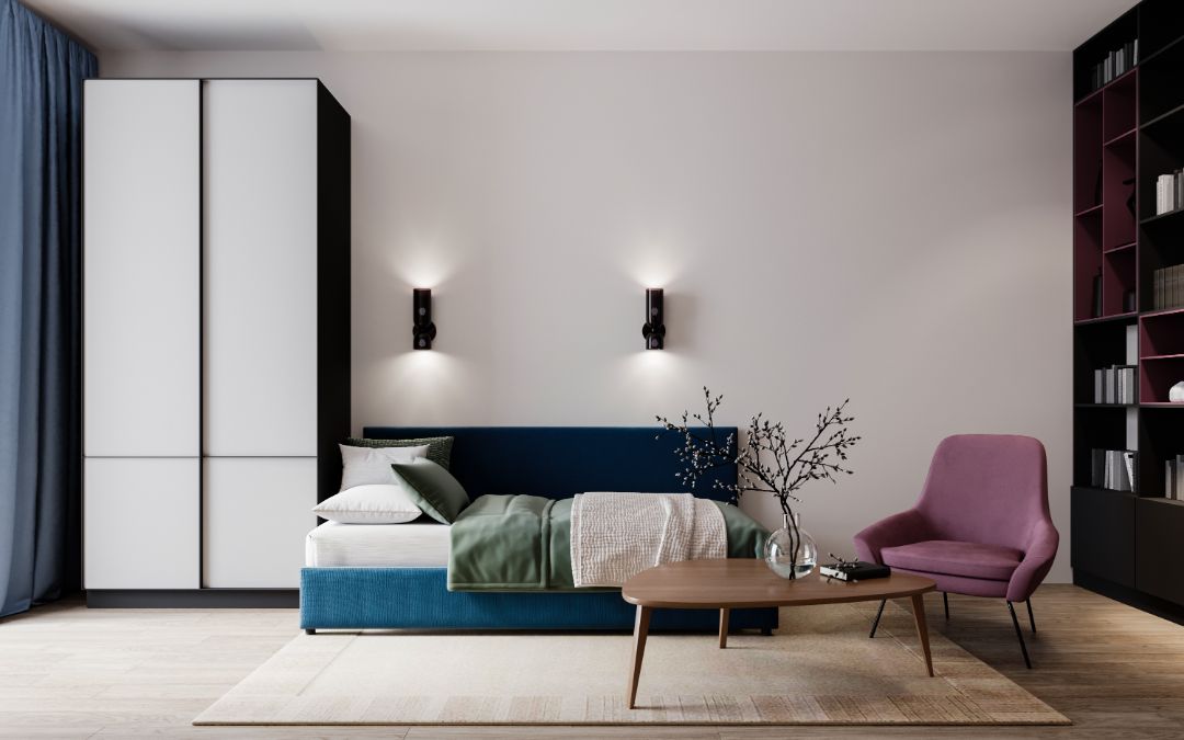 Для каждого здесь предусмотрено своё пространство, гостиная в данном проекте универсальна и оборудована мебелью с системой диван-кровать, вечером превращается в изолированную спальню родителей. Бабашка-преподаватель с большим стажем и принимает у себя своих учеников, пространство для неё спроектировано так, чтобы исключить восприятие комнаты, как спальни, скорее это больше напоминает кабинет, но со всеми удобствами и комфортом.