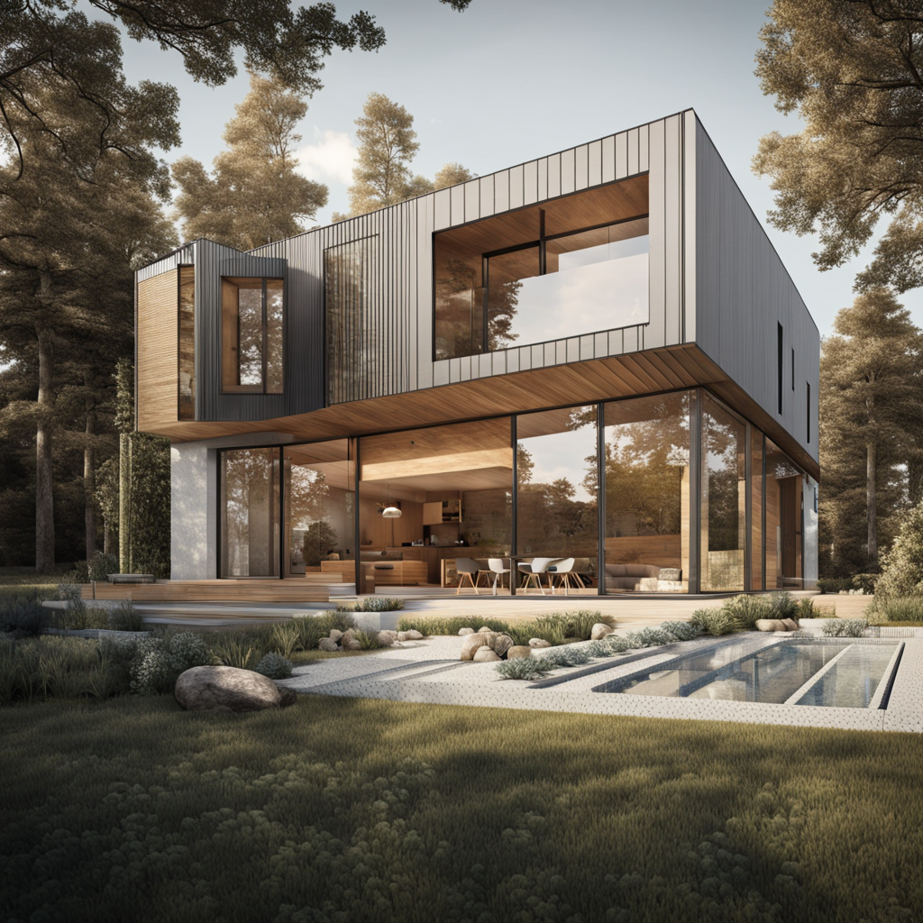 Все больше наших клиентов выбирают комплексный подход к оформлению фасада, который удачно вписывается в выбранную стилистику и идеально сочетается с дизайном всего интерьера. Совсем недавно мы представили нашим заказчикам различные рендеры фасада, среди которых ими был одобрен вариант деревянной термопанели с горизонтальной фрезой в цвете темный орех.